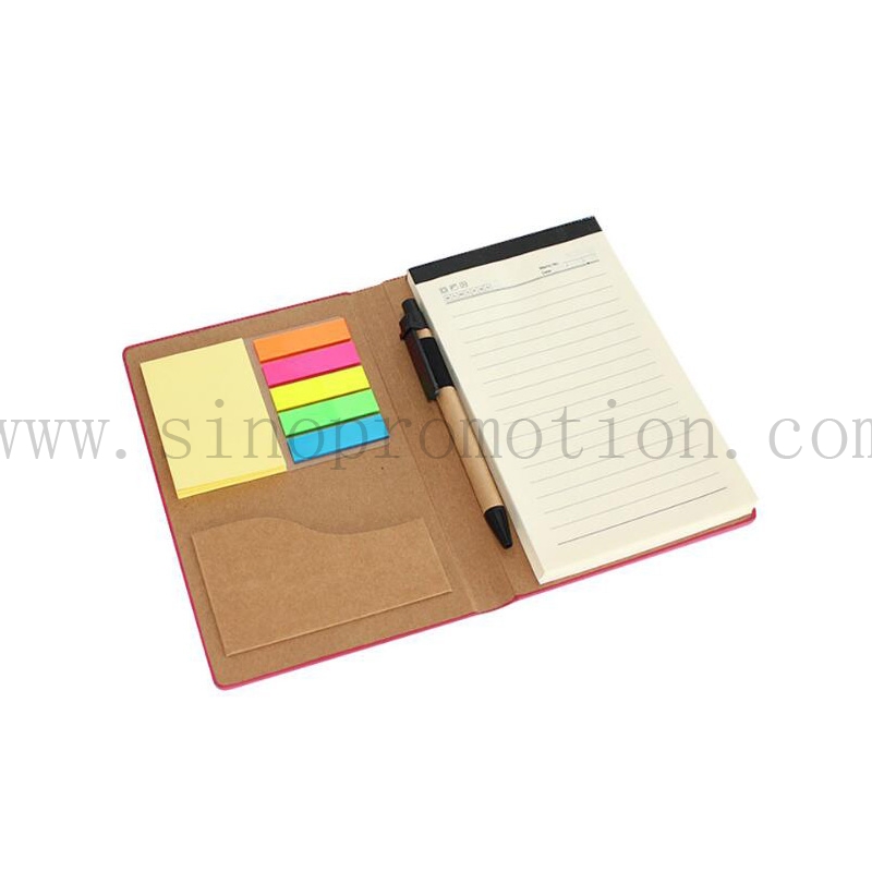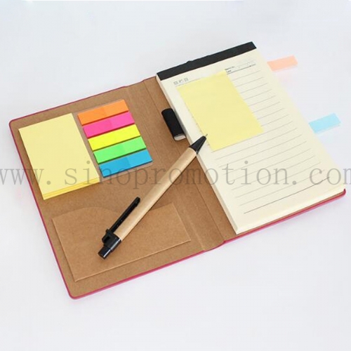 Pu leather covers different size adhensive pads,including 70pcs of 80g lined paper by size(6.89"x3.94"),one 3" x 1.97" yellow pad (25 sheets), and five 1-3/4" x 1/2" neon pads (25 sheets),1pc eco pen,name card holder,whole pad with elastic cord