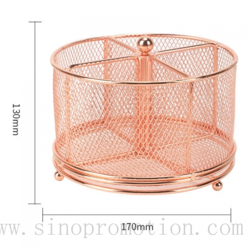 Made of steel with rose gold finish,with 4 big componets to hold all your pens,desk accessories,cosmetic accessories,this pen holder can rotate so it is easy to get what you need quickly